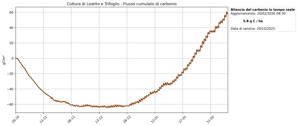 Di seguito e riportato il bilancio del carbonio in tempo reale, a partire dalla data di inizio dell’ultimo ciclo colturale, attraverso la misura diretta dei flussi semi orari tra il sistema suolo-vegetazione e l’atmosfera utilizzando la tecnica della correlazione turbolenta.